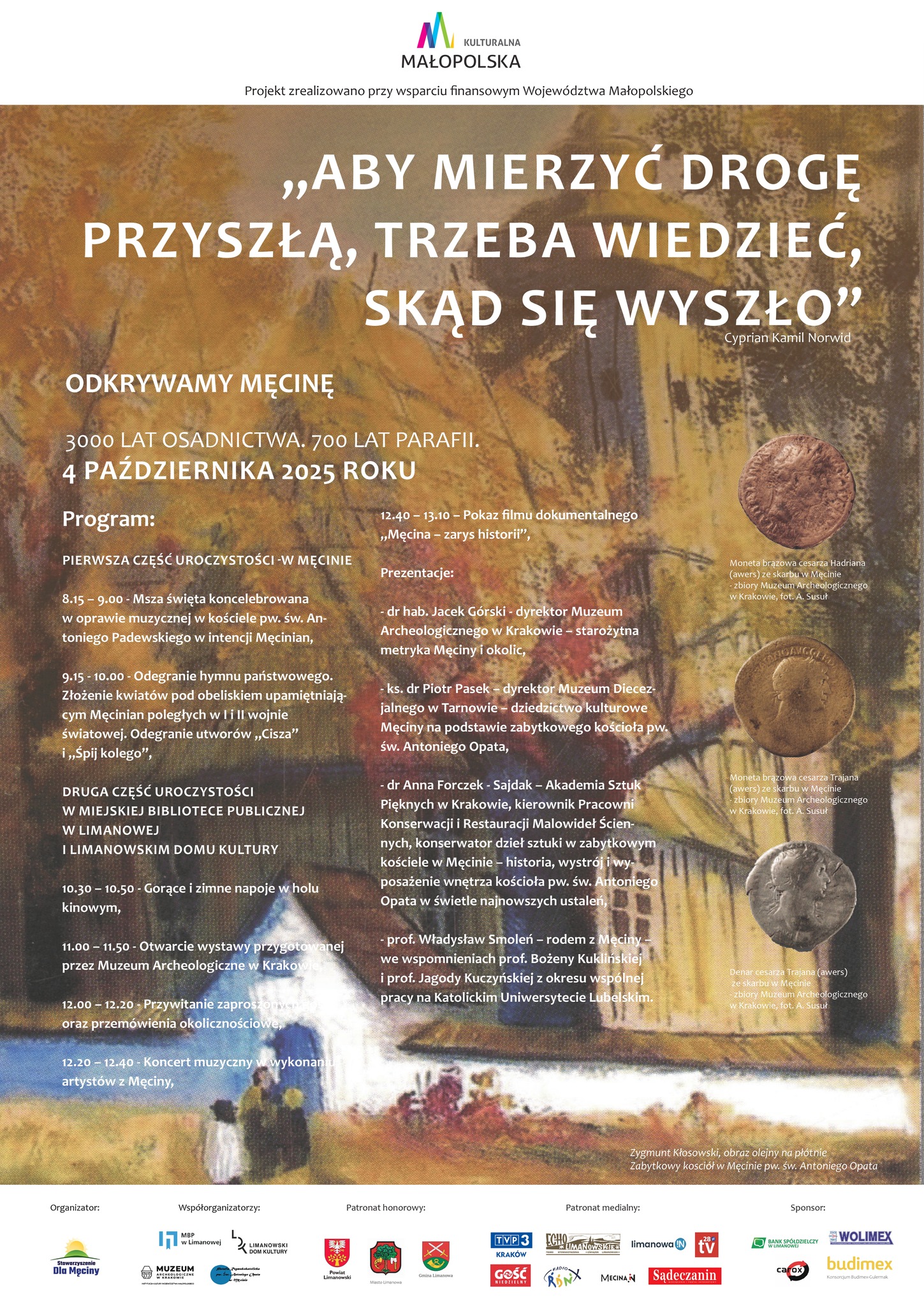 „Aby mierzyć drogę przyszłą, trzeba wiedzieć, skąd się wyszło…” – to słowa, które stały się myślą przewodnią spotkania pn. „Odkrywamy Męcinę. 3000 lat osadnictwa. 700 lat parafii”. W imieniu organizatorów serdecznie zapraszamy do udziału w tym wyjątkowym wydarzeniu. Szczegóły znajdą Państwo na plakacie.
