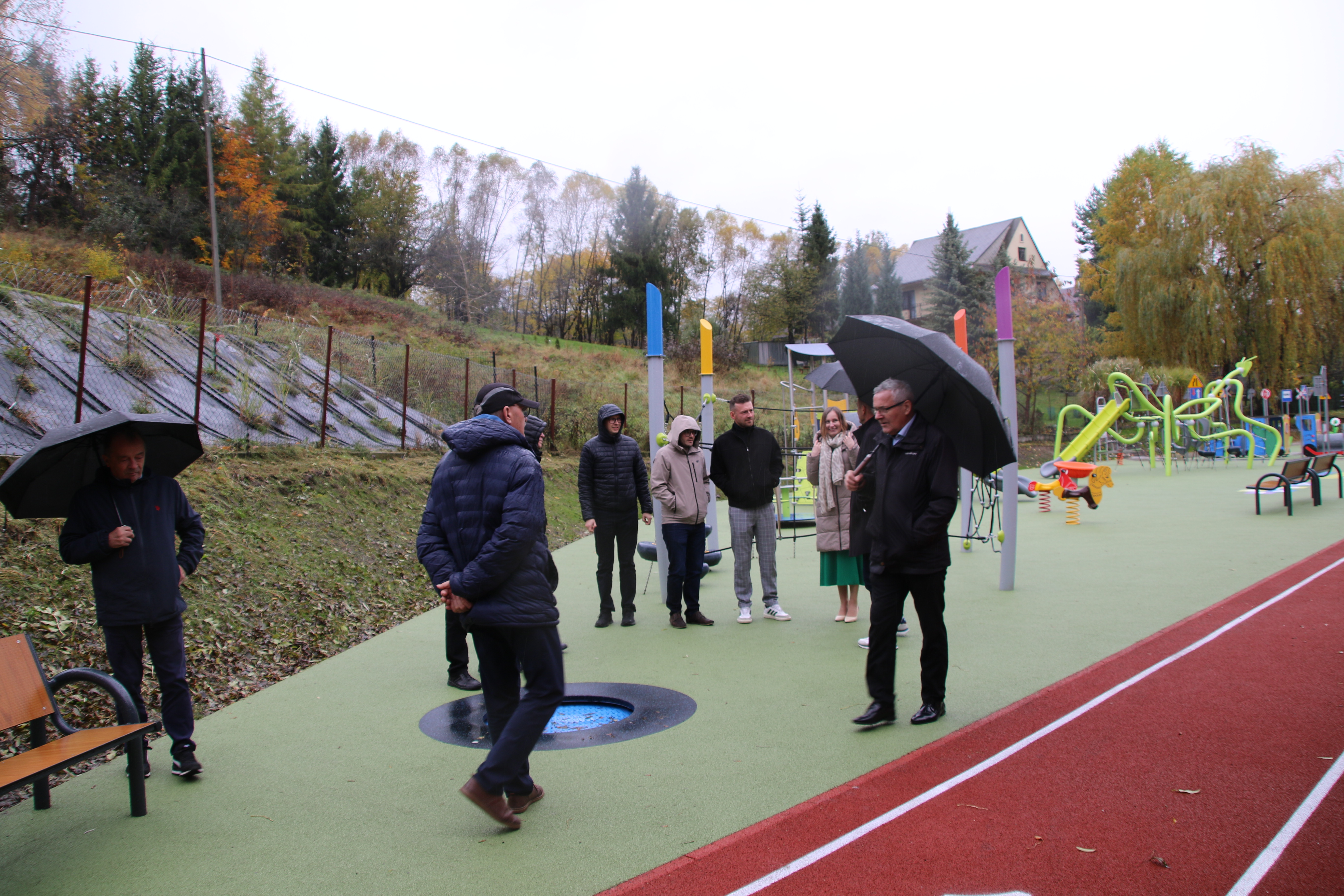 Po części teoretycznej radni udali się w teren, aby dokonać oceny stanu realizowanych inwestycji. Pierwszym punktem wizytacji był nowo powstały kompleks rekreacyjno-sportowy przy Zespole Szkoły Podstawowej i Przedszkola w Słopnicach. W ramach inwestycji wykonano m.in.: plac zabaw, dwutorową bieżnię prostą, skocznię w dal oraz miasteczko ruchu drogowego służące nauce bezpiecznej jazdy na rowerze. Wartość przedsięwzięcia wyniosła 1 063 899 zł.