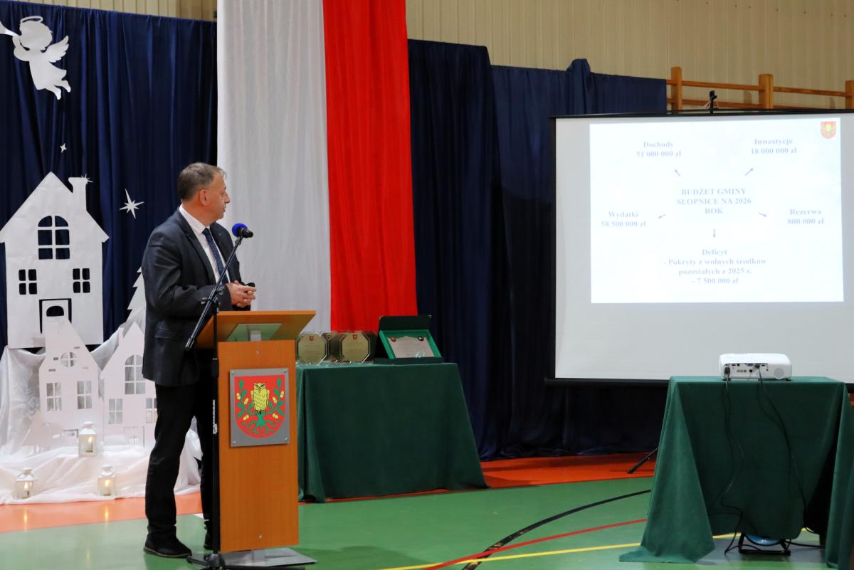 Jednym z kluczowych punktów obrad było uchwalenie budżetu gminy na 2026 rok. Radni jednogłośnie przyjęli uchwały określające plan finansowy samorządu. Dochody gminy zaplanowano na poziomie 51 mln zł, natomiast wydatki wyniosą 58,5 mln zł. Co istotne, gmina nie przewiduje zaciągania kredytów, ponieważ posiada wysoką nadwyżkę w kwocie 7,5 mln zł i nadal pozostaje samorządem bez zadłużenia. Rezerwa budżetowa na 2026 rok wynosi 800 tys. zł. Znaczną część przyszłorocznego budżetu bo ponad 30 % wydatków – tj. kwotę 18 mln zł przeznaczono na inwestycje. W planach są dalsze działania na rzecz rozwoju infrastruktury i poprawy jakości życia mieszkańców. Środki w wysokości 6 mln zł, zaplanowano na rozbudowę sieci wodociągowo-kanalizacyjnej. Gmina oczekuje również na decyzję o dofinansowaniu budowy 64 przydomowych oczyszczalni ścieków na terenach o rozproszonej zabudowie oraz prowadzi działania zmierzające do pozyskania alternatywnych źródeł wody. Wśród zaplanowanych inwestycji znalazła się także budowa obiektu rekreacyjnego przy Zespole Placówek Oświatowych (1 mln zł), modernizacja i bieżące utrzymanie dróg gminnych (ok. 2 mln zł) oraz rozpoczęcie budowy wielofunkcyjnego budynku w centrum Słopnic, na który w przyszłorocznym budżecie zarezerwowano ponad 7,5 mln zł. Obiekt ten ma pełnić funkcję nowoczesnego centrum życia społecznego i kulturalnego gminy, oferując przestrzeń dla lokalnych organizacji i stowarzyszeń, seniorów, organizacji wydarzeń oraz innych inicjatyw mieszkańców.