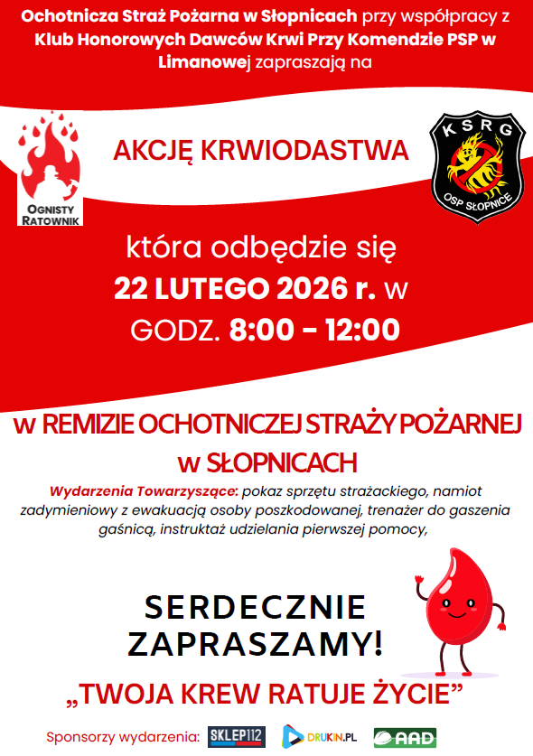 Ochotnicza Straż Pożarna w Słopnicach, przy współpracy z Klubem Honorowych Dawców Krwi przy Komendzie PSP w Limanowej, zapraszają mieszkańców do udziału w akcji krwiodawstwa, która odbędzie się 22 lutego 2026 r. (niedziela) w remizie OSP w Słopnicach Dolnych.