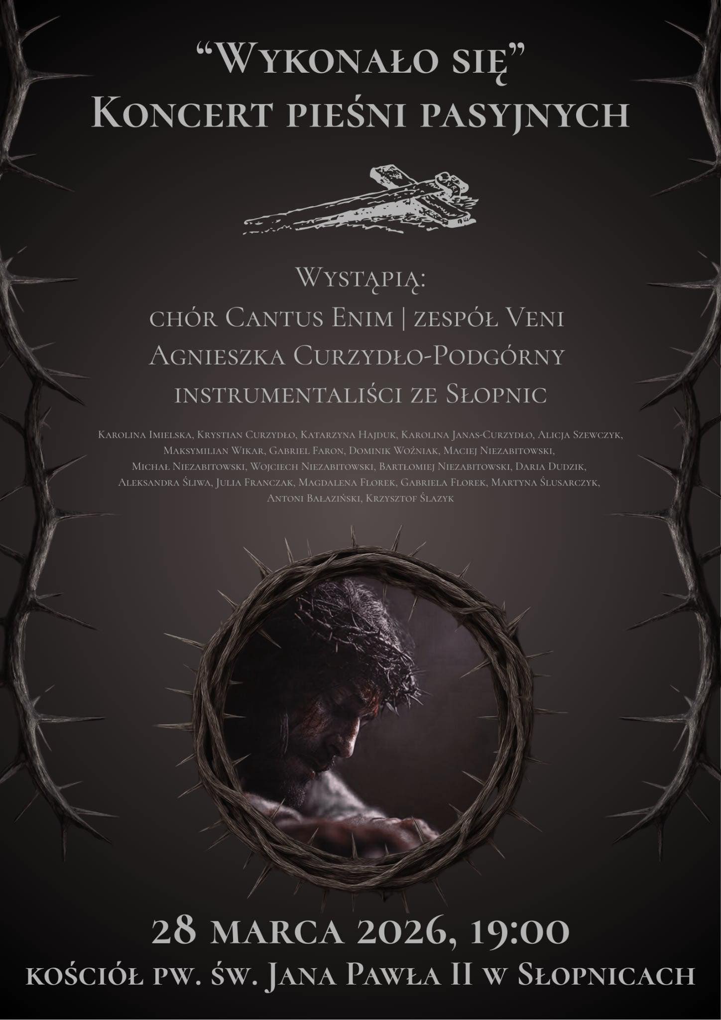 W sobotę, 28 marca 2026 r. o godz. 19:00 w kościele pw. św. Jana Pawła II w Słopnicach odbędzie się Koncert Pieśni Pasyjnych „Wykonało się”. Wydarzenie przygotowuje Chór Cantus Enim wraz z zaproszonymi muzykami i wokalistami ze Słopnic, którzy wspólnie zaprezentują program o charakterze pasyjnym.