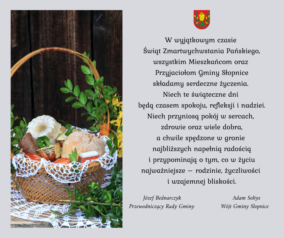 W tym szczególnym czasie Świąt Wielkanocnych chcemy przekazać mieszkańcom i przyjaciołom Gminy Słopnice serdeczne życzenia zdrowia, spokoju i pomyślności.
