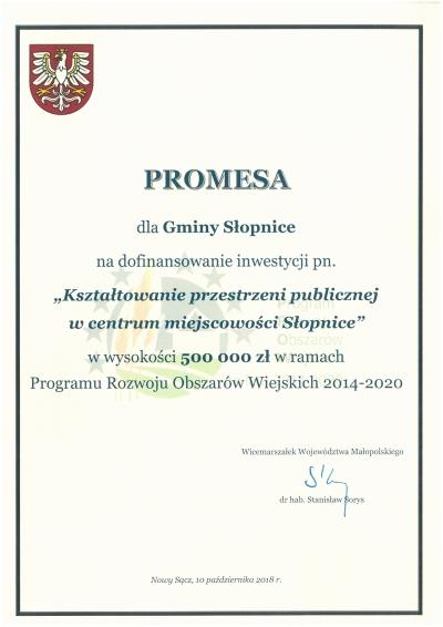 Koszt realizacji inwestycji szacowany jest na blisko 1 mln zł. Dofinansowanie przyznane Gminie Słopnice przez samorząd województwa małopolskiego ze środków PROW 2014-2020 stanowi ok. 50 % kosztów zadania. Promesę opiewającą na 500 000 zł przekazali wójtowi Słopnic wicemarszałek Stanisław Sorys oraz przewodnicząca Sejmiku Województwa Małopolskiego Urszula Nowogórska. Wręczenie promes odbyło się 10 października w Miasteczku Galicyjskim w Nowym Sączu.