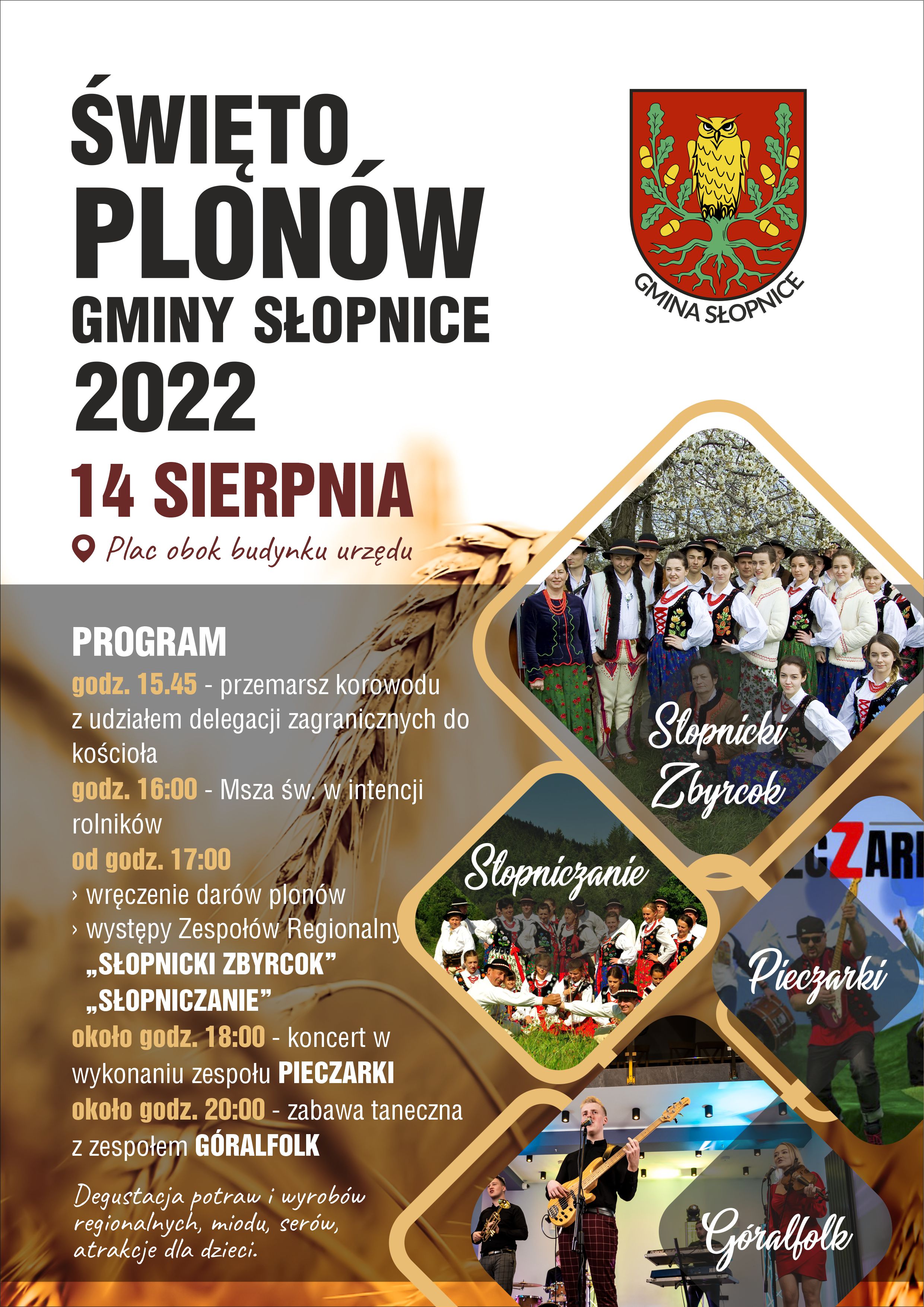 Wójt Gminy Słopnice serdecznie zaprasza na Święto Plonów Gminy Słopnice, które odbędzie się 14 sierpnia 2022 r. (niedziela). Zapraszamy do udziału i zapoznania się ze szczegółami programu imprezy.