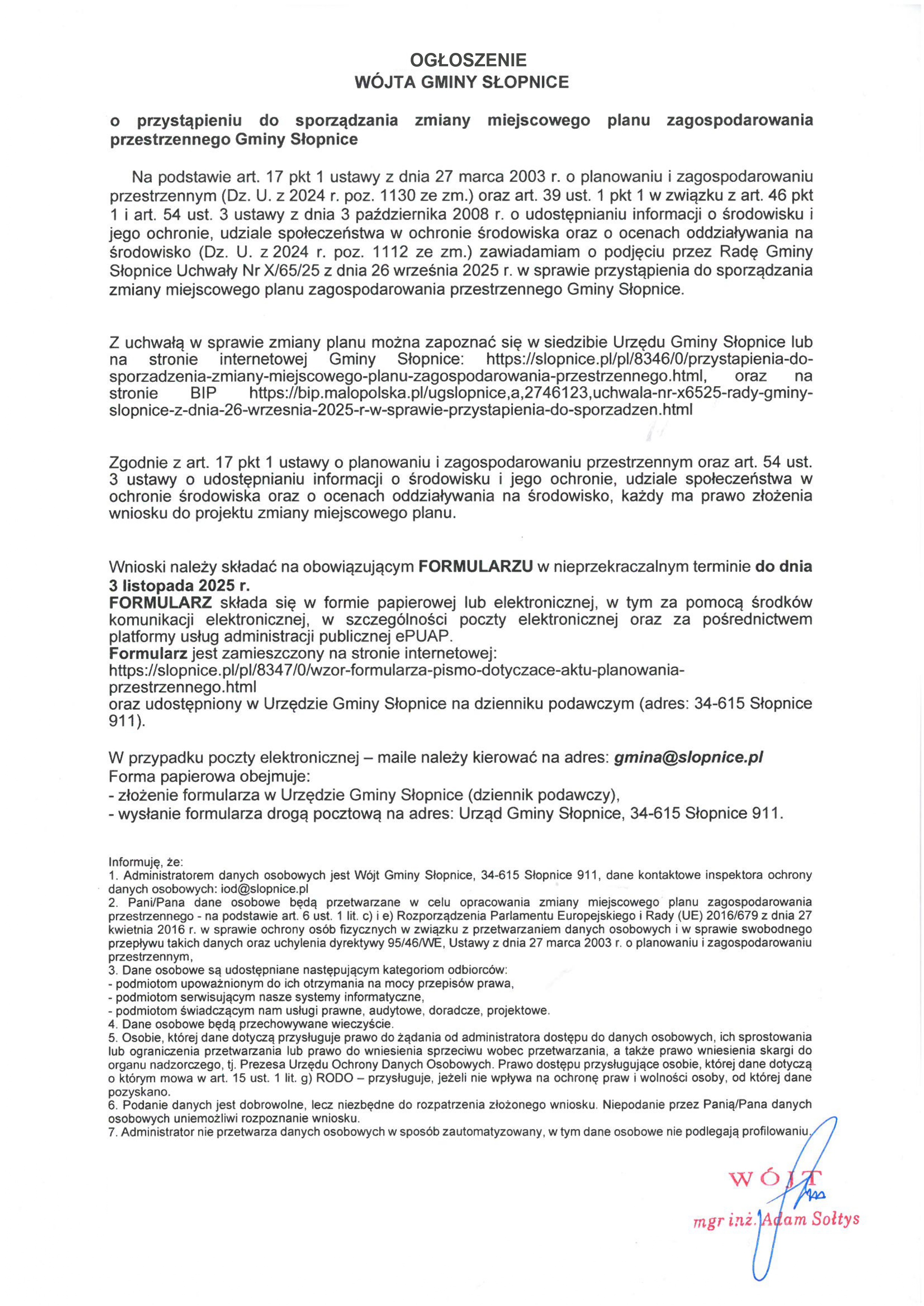OGŁOSZENIE WÓJTA GMINY SŁOPNICE O PRZYSTĄPIENIU DO SPORZĄDZENIA ZMIAN MIEJSCOWEGO PLANU ZAGOSPODAROWANIA PRZESTRZENNEGO GMINY SŁOPNICE 02.10.2025 8:54 Treść Facebook Twitter Email Drukuj