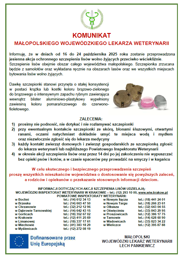 Małopolski Wojewódzki Lekarz Weterynarii uprzejmie informuje, że w dniach od 16 do 24 października 2025 roku na terenie województwa małopolskiego zostanie przeprowadzona akcja ochronnego szczepienia lisów wolno żyjących przeciwko wściekliźnie. Szczepienie lisów obejmie obszar całego województwa małopolskiego.