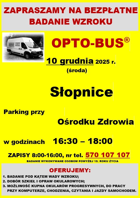 Informujemy, że w dniu 10 grudnia 2025 r. na parkingu Ośrodka Zdrowia w Słopnicach w godzinach 16:30–18:00 będzie stacjonował OPTO-BUS. Osoby zainteresowane powyżej 15 roku życia będą mogły skorzystać z możliwości wykonania bezpłatnych badań wzroku.